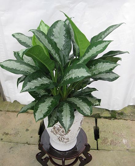 雅麗皇后又名白雪粗肋草、銀河粗肋草。植株直立,葉片披針形,革質,銳尖,葉深綠色。中肋兩側具銀灰色大塊條狀斑塊,葉緣與中脈處為暗綠色。本種生長勢強,易生分枝。耐陰性極強。銀河粗肋草:葉闊披針形,沿中肋有銀灰色寬條斑